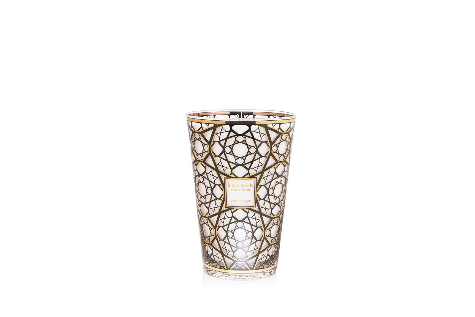 Baobab Duftkerze Arabian Nights Safran, Oud und WeihrauchDie Duftkerze Arabian Nights von Baobab hüllt Ihr Zuhause in holzige Aromen der geheimnisvollen Welt Arabiens. Lassen Sie sich in die Paläste des nahen Ostens entführen. Das Glas des Duftflakons ist mit einem schwarz-goldenen Siebdruckdekor mit 9-karätigem Gold versehen, dessen Motiv von den berühmten Moucharabieh inspiriert wurde. Sie erinnern also an die dekorativen, durchbrochenen Holzgitter vor Fenster und Türen aus der traditionellen islamischen Architektur. Somit ist die Duftkerze auch ein wunderschönes Dekorationsobjekt und Sammlerstück, das einen besonderen Look in Ihre Innenräume bringt. Die Flamme scheint durch das Glas hindurch und hüllt die Umgebung in Licht und Schatten. Die Duftkerzen der Baobab CollectionJede Baobab-Duftkerze ist ein erlesenes Stück Handwerkskunst. Das edle Wachs (zu 90 % veredeltes Mineralwachs) wird von Hand in die mundgeblasenen Gläser gegossen. Es hat eine sehr gute Brennqualität. Die Dochte werden in Europa aus ägyptischer Baumwolle hergestellt. Diese tollen Unikate eignen sich auch perfekt als Geschenk.