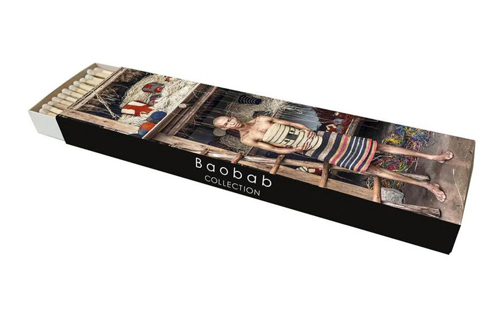 Baobab Streichhölzer "Artisans" - 22cm lange Designer-Streichhölzer in dekorativer Schachtel mit Madagaskar-Motiv, ideal für große Kerzen.