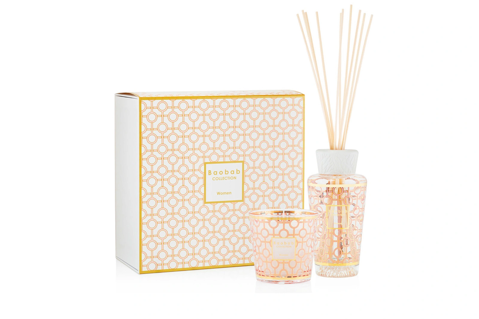 1. Duftkerze My First Baobab Women – aus Geranie, Rose und MoschusGeranie, pudrige Rose und Moschus erzeugen den femininen Duft dieser exklusiven Kerze aus der My First Baobab Collection. Diese dekorative Kerze besticht durch ihr handgemaltes geometrisches Ornament in gold und rosa.Baobab unterstützt mit jedem Kauf einer Kerze aus dieser Collection die Forschung an Brustkrebs der Breast International Group. 2. Raumduft-Diffuser My First Baobab Women – 250 ml – aus pudriger Rose und MoschusDer unwiderstehlich feminine und sinnliche Duft aus den Essenzen von Rosen und Moschus unterstreicht die Weiblichkeit einer jeden Frau.Das Siebruckdesign auf dem edlen Glasflakon besteht aus rosa und goldfarbenen Ornamenten. Der Diffuser und die Duftkerze kommen in einer edlen Geschenkbox im exklusiven Baobab Women-Design. Funktionsweise und VerwendungDie Diffuser-Stäbchen verteilen den Duft durch die Kapillaren des Holzes von alleine im Raum, geräuschlos und ohne Strom. Anders als bei einem Sprühgerät legt sich bei diesem Diffuser auch kein Feuchtigkeitsnebel auf Ihre Möbel und Einrichtung. Um die Stärke des Duftes zu bestimmen, variieren Sie einfach die Menge der Stäbchen, die Sie im Raumduft-Spender platzieren. Um eine sofortige Intensitätserhöhung des Duftes zu bekommen, drehen Sie die Diffuser-Stäbchen einfach um.Der Flakon kann ganz einfach wiederbefüllt werden – Nachfüllpacks finden Sie ebenfalls hier im Shop.Die angegebene Duftdauer ist ein Richtwert und ist von vielen Faktoren abhängig, wie zum Beispiel der Raumtemperatur und Größe der Räume und von den Belüftungsbedingungen. MY FIRST BAOBAB – die KollektionLernen Sie die schönsten und beliebtesten Baobab-Düfte kennen und experimentieren Sie damit in Ihren Räumlichkeiten! Die Kollektion MY FIRST BAOBAB beinhaltet eine Auswahl der beliebtesten Baobab-Duftkerzen in der Größe Max One und Baobab-Raumduftdiffuser mit 250 ml Inhalt. Dazu gibt es eine wunderschöne Schachtel, die das Design der Kerze/des Flakons trägt. Inklusiv gibt es eine schöne Baobab-Geschenktasche dazu.