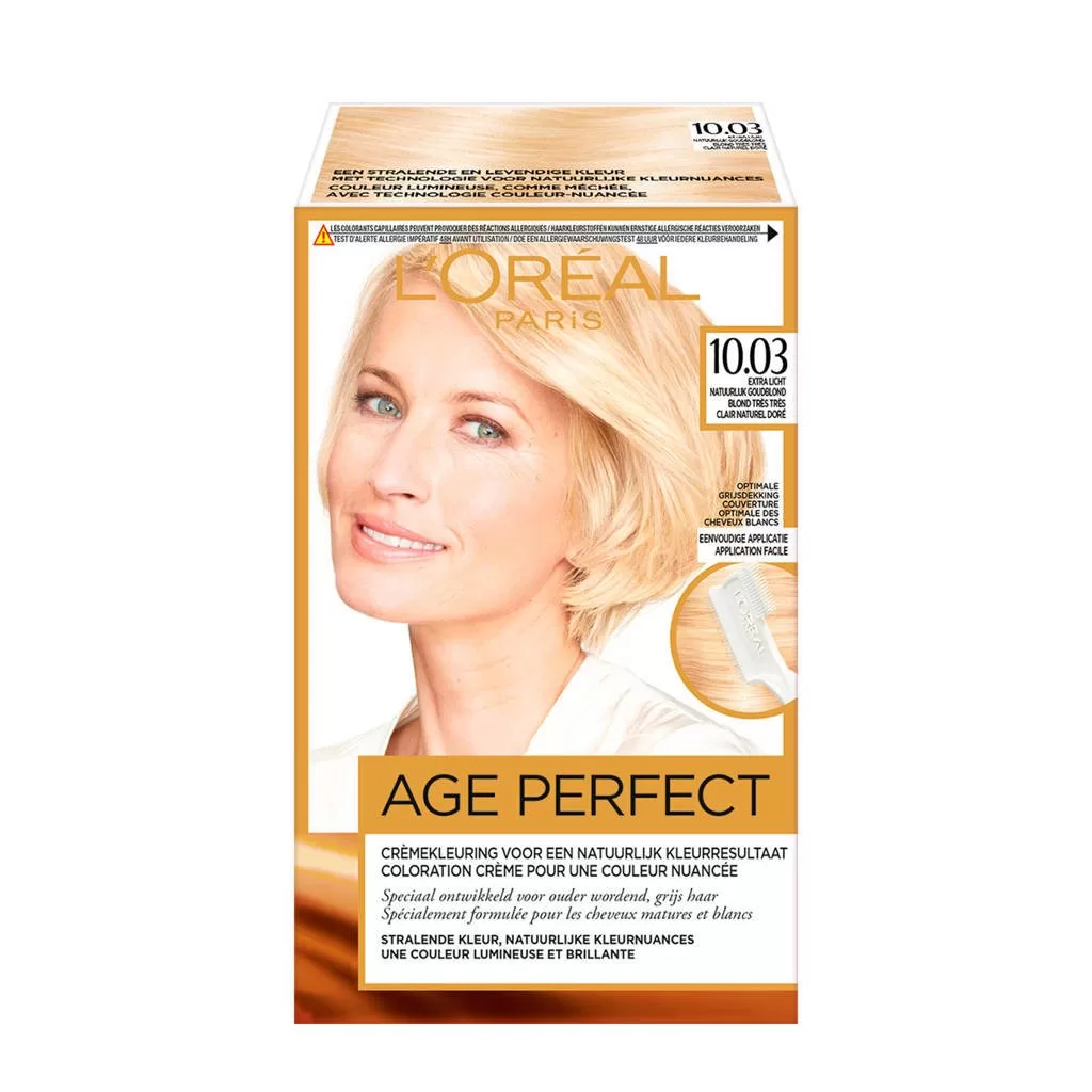 Age Perfect is de haarkleuring speciaal ontwikkeld voor een mooie blonde kleur en perfecte grijsdekking. De Age Perfect haarkleuring past zich aan naargelang het haar meer of minder grijs is. Daarnaast vermengt de uitgroei zich met de rest van het haar en is hierdoor minder zichtbaar. De kleuring is gemakkelijk aan te brengen dankzij de bijgeleverde borstel.