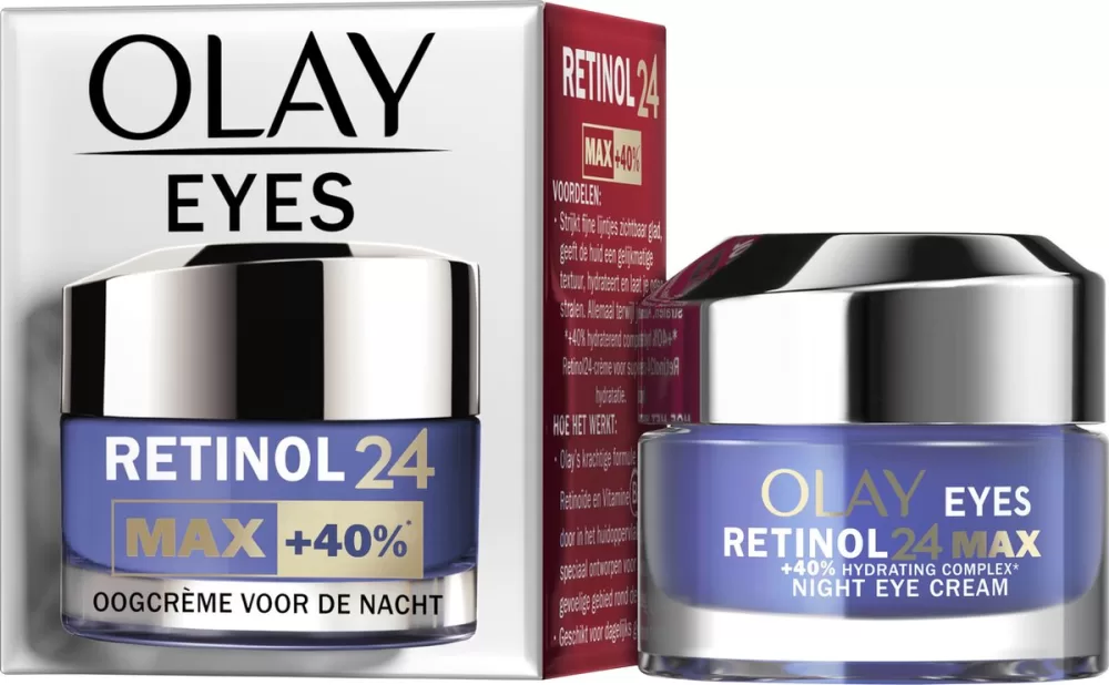 Haal het maximale uit je Retinol24. Deze Olay Regenerist Retinol24 MAX oogcrème voor de nacht hydrateert, verzacht en revitaliseert de gloed van de ogen voor jonger uitziende en stralende ogen. De hydraterende oogcrème met de krachtigste formule van Olay met retinoïde + vitamine B3 bevat 40% meer hydraterende bestanddelen om de ogen een goed verzorgde gloed te geven. Breng Olay Retinol24 MAX oogcrème aan rondom de ogen voor zichtbaar gladdere fijne lijntjes en een gelijkmatigere textuur. De crème is speciaal ontwikkeld voor onder de ogen, trekt snel in en dringt diep door in het huidoppervlak. Breng de Olay Retinol24 MAX verstevigende oogcrème dagelijks aan en je huid ziet er echt heel anders uit. Gebruik Olay oogcrème voor onder de ogen dagelijks gedurende 28 dagen. (in vergelijking met Retinol24)