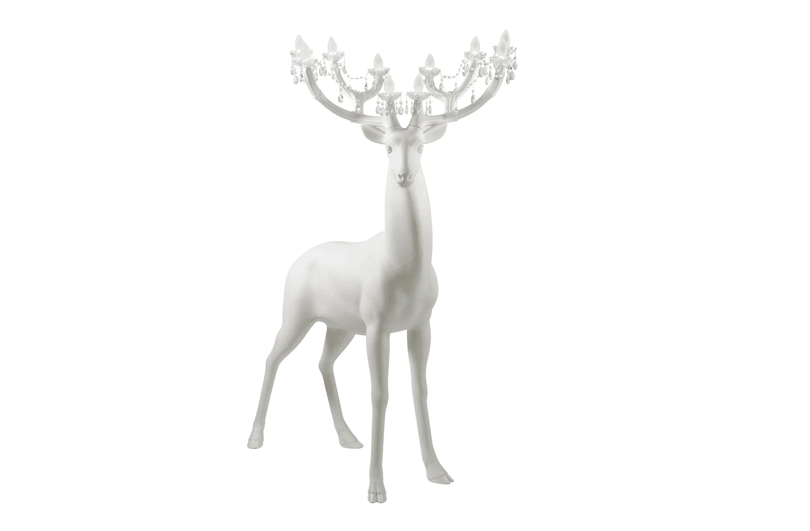 Qeeboo – Sherwood Outdoor Stehlampe WhiteSherwood ist ein beeindruckender, 2 Meter hoher Hirsch, dessen Geweih mit Kristallen und Anhängern zu einem Kronleuchter gestaltet wurde.Die starke natürliche Energie des Tieres wird von Marcantonio verewigt, der sich den Hirsch vorstellt, wie er sich stolz durch einen Wald bewegt und dank seiner mächtigen, leuchtenden Hörner ein mystisches Leuchten in der Nacht erzeugt, als wäre er ein Wegweiser, dem man folgen sollte. In diesem traumhaften Universum zwischen Fantasie und Realität wird Sherwood zum Protagonisten von Innen- und Außenräumen.