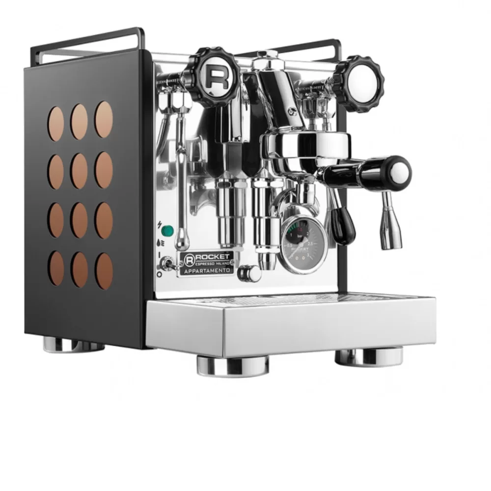 ROCKET Appartamento – Nera/Kupfer – Siebträger – Espressomaschine – Die kompakte Siebträger Espressomaschine Rocket Appartamento Nera Kupfer ist ein Zweikreiser mit E61 Brühgruppe. Sie ist die kleinste Maschine in der Rocket-Familie. Die Rocket-Ingenieure optimierten das Chassis, das Design und die Komponenten bei der Rocket Appartamento ohne Kompromisse.Sie besticht durch eine konsequent reduzierte Ausstattung. Merkmale:- Kompakte klassische Zweikreis-Siebträgermaschine mit manueller E 61-Brühgruppe- Optimiertem polierten Edelstahlgehäuse und mit roten Inlets an den Seitenteilen- stylische, flache Metallfäche- 1,8 Liter Kupferkessel mit Pressostat, Vintage-Kippschalter- Ulka Intervallpumpe- 3 Bar Kesseldruckmanometer- Kugelgelenk Dampflanze und Heißwasser- Perlator mit großen Rocket-Vintage-Drehventilen- 2,5 Liter Frischwassertank mit Ansaugventil- Brühgruppe wird durch ein Heißwasser-Kreislaufsystem beheizt- Mater Pressostat- ein Kesselmanometer – Druckanzeige am Kessel- sehr gute und saubere Verarbeitung, Spaltmaße einheitlich- schönes Design, gute Technik im Inneren- ECO MODE: Automatische Abschaltung nach 1,5h ohne Benutzung Weitere Merkmale: – Abmessungen BHT: 274 x 360 x 425mm- Gewicht: 21kg- Wassertankinhalt 1,8 Liter- Leistung: 1200W – Im Lieferumfang enthalten: – 2 massive Chrom-Messing- Siebträger mit 2 Siebeinsätzen- Rocket Alu-Tamper