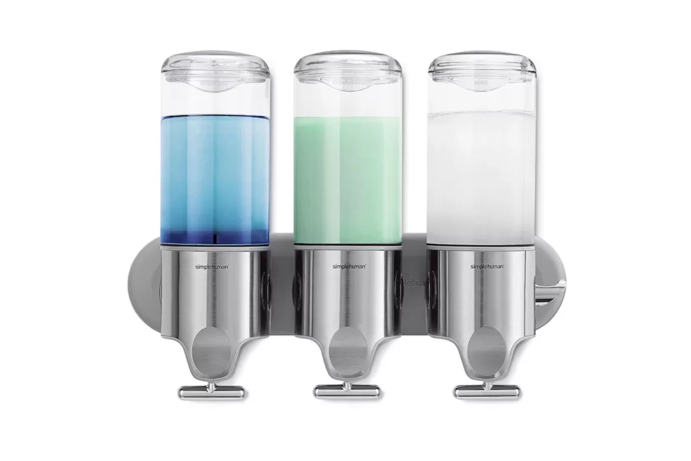 simplehuman Dreifachspender mit Wandhalterung Unsere Spender mit Wandhalterung beseitigen das Durcheinander von Flaschen in Ihrer Dusche und sorgen dafür, dass alles, was Sie brauchen, leicht erreichbar ist. Der ergonomische T-förmige Hebel sorgt für präzise, einhändige Dosierung. An dem Haken können Sie einen Rasierer, Schwämme und sonstige Accessoires aufhängen. Kann problemlos mit Klebeband montiert werden. Für eine sicherere Montage einfach an der Wand festschrauben. (Schrauben nicht im Lieferumfang enthalten) Ich bin ergonomisch – Unser ergonomischer T-förmiger Gusshebel dosiert die richtige Menge an Seife, Shampoo oder Pflegespülung.Praktischer Aufhänger – Für Rasierer, Schwämme oder weiteres Zubehör.Kein Überlaufen – Durch die breite Öffnung ist das Nachfüllen schnell und einfach – ohne Überlaufen!rostfreies Material – Aus Edelstahl und eloxiertem Aluminium hergestellt.